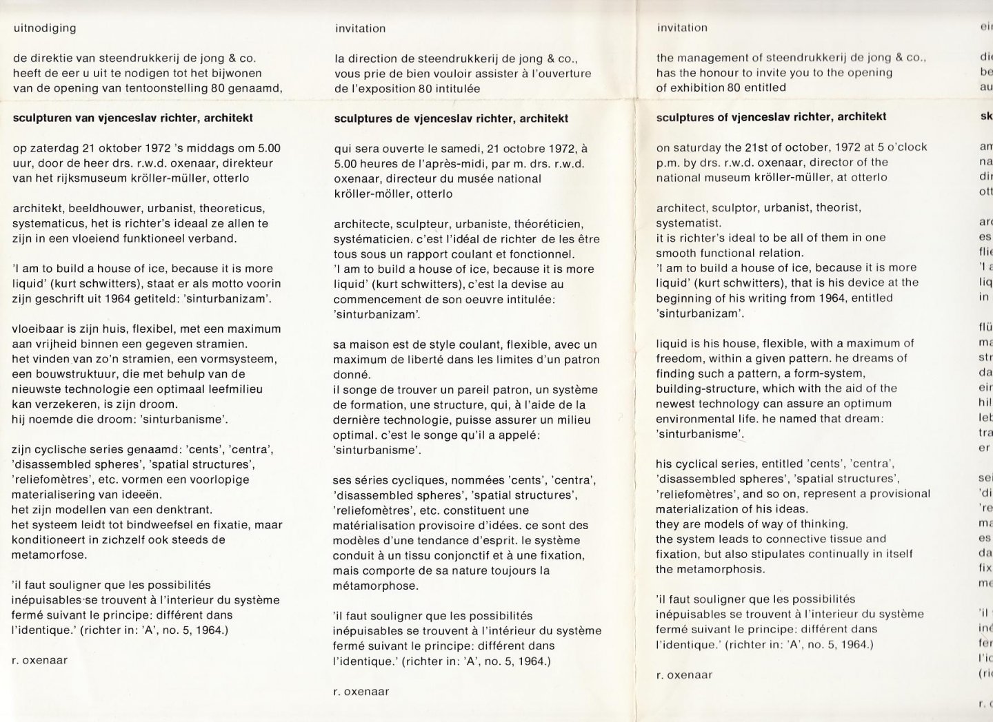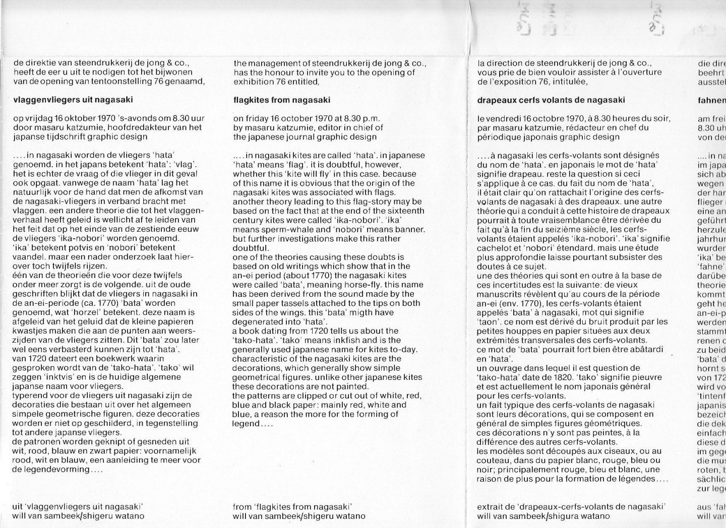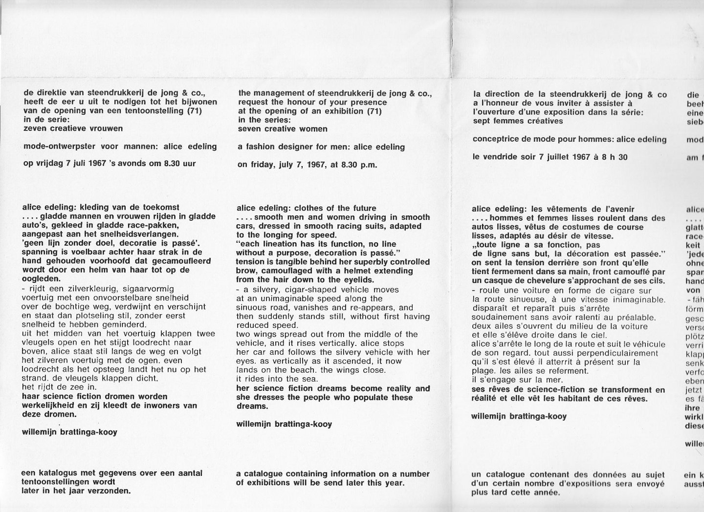 | Titel: | uitnodigingen van de directie van steendrukkerij de jong & co voor de opening van een tentoonstelling *tentoonstelling 71. zeven creatieve vrouwen. een serie tentoonstellingen. een mode-ontwerpster voor mannen: alice edeling *vlaggenvliegers uit |
