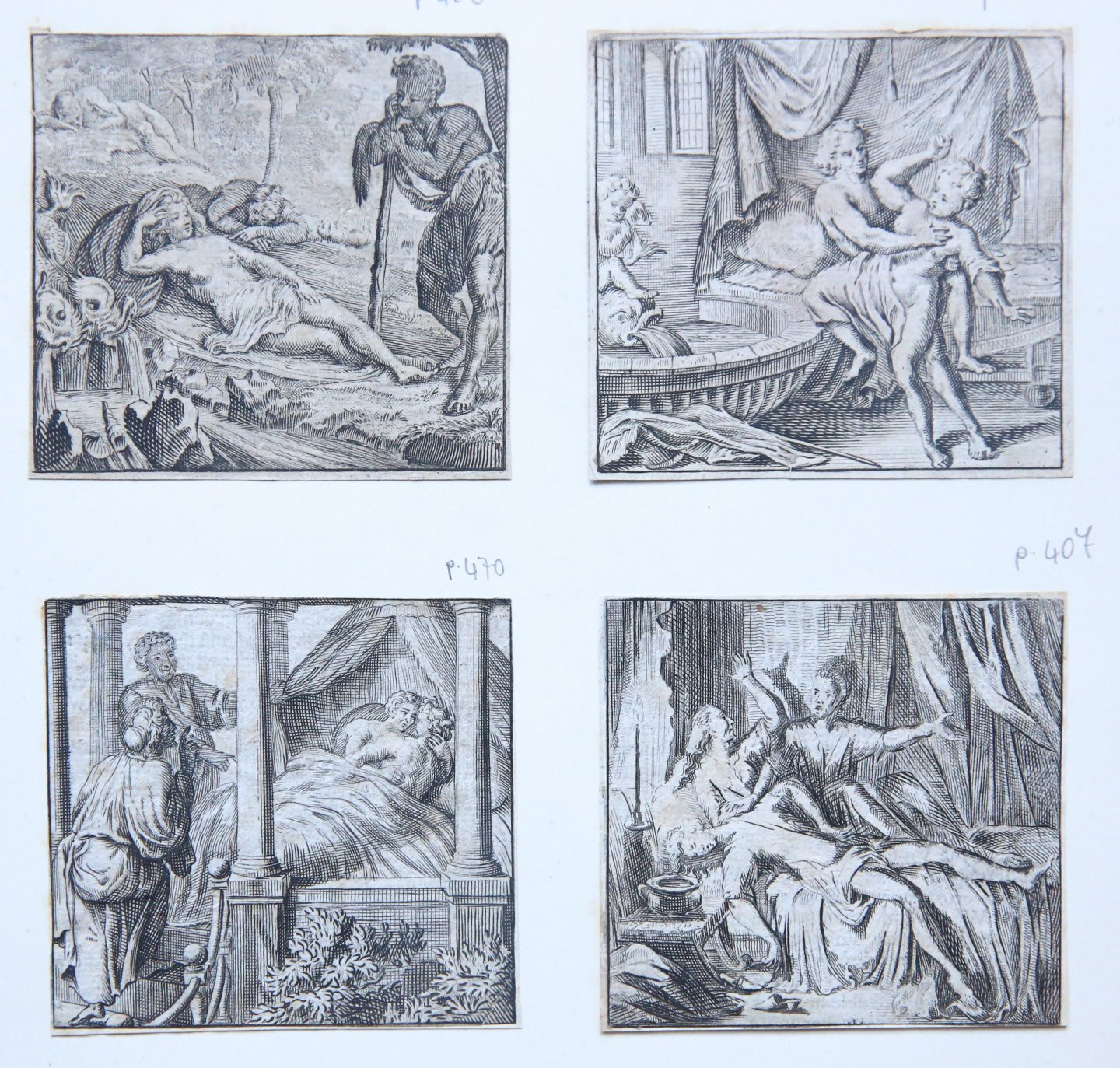 | Bijzonderheden: | Four plates extracted from the 1740 edition of the 'Novelle' (stories) by Giovanni Boccaccio in its Dutch translation. The four are mounted on a cardboard. Two are backed for conservation purposes. In clockwise order, they illustrate "Efigenia and... |