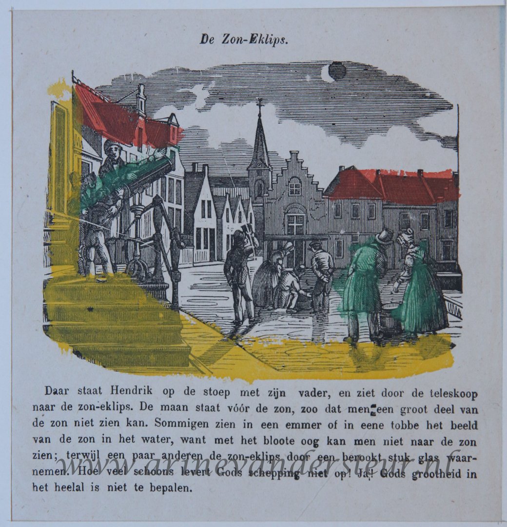 | Bijzonderheden: | Coloured woodcut with red, yellow and green. Image of the Sun eclipse (zon eclips) with people. Text underneath the image: daar staat Hendrik op de stoep met zijn vader, en ziet door de teleskoop naar de zon-eklips. De maand staat vóór de zon, z... |