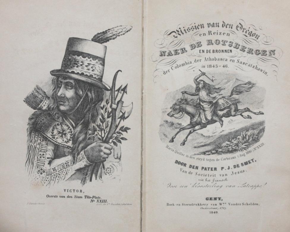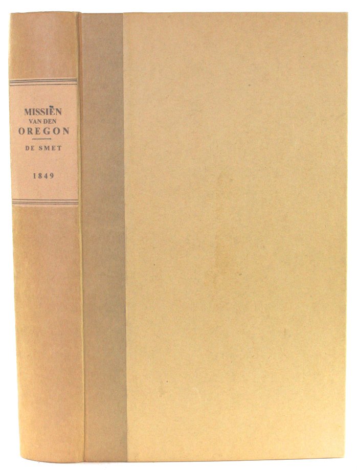 8vo, recently bound in paper over boards. xvi, 17-425 pages.. Engraved title and frontispiece portrait. Portion of original printed wrapper affixed inside front cover. Three maps (repaired with minimal loss) and 14 plates. Good copy. "Contains Father Smet's description of his travels through and about the central Columbia River plateau as well as a trip up that river to its source, during which he continued on to the Athabasca River, the country of the Assiniboines, and arrived at Fort Augusta about January 1, 1846…" This edition ( translated from the French) seems to have been prepared by the author himself. It contains more material than the edition in English (“Oregon Missions”), the illustrations are different, and the three maps are entirely new. He was called "Grote Zwartrok" by the Indians. |