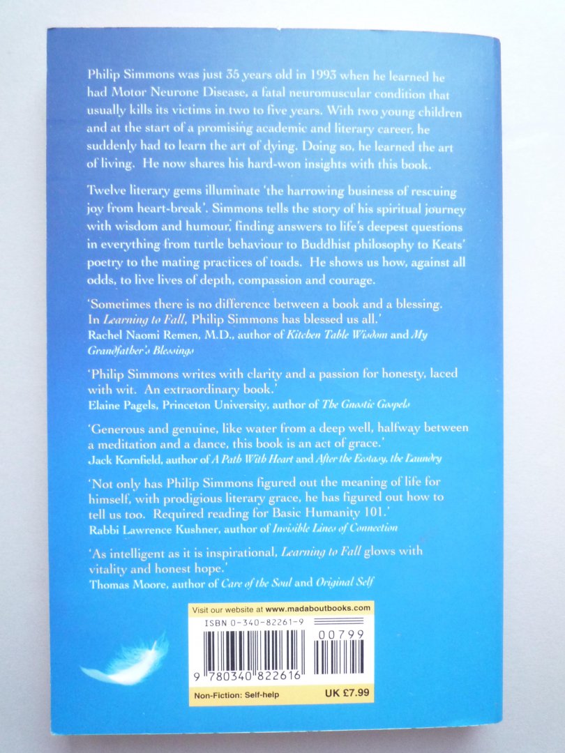 Philip Simmons was just 35 years old when he learned he had Motor Neurone Disease, a fatal condition that usually kills its victims in two to five years, but which Philip has already well exceeded. With a strong marriage, two young children and the start of a promising literary and academic career, he suddenly had to say goodbye. But, by learning the art of dying he has succeeded, against the odds, in learning the art of living. In 12 chapters, this book tells the story of Philip's spiritual journey. Finding answers to life's deepest questions - and introducing a host of colourful characters along the way - Philip illustrates, above all, that we can learn to live lives of depth, compassion and courage no matter what life throws at us.