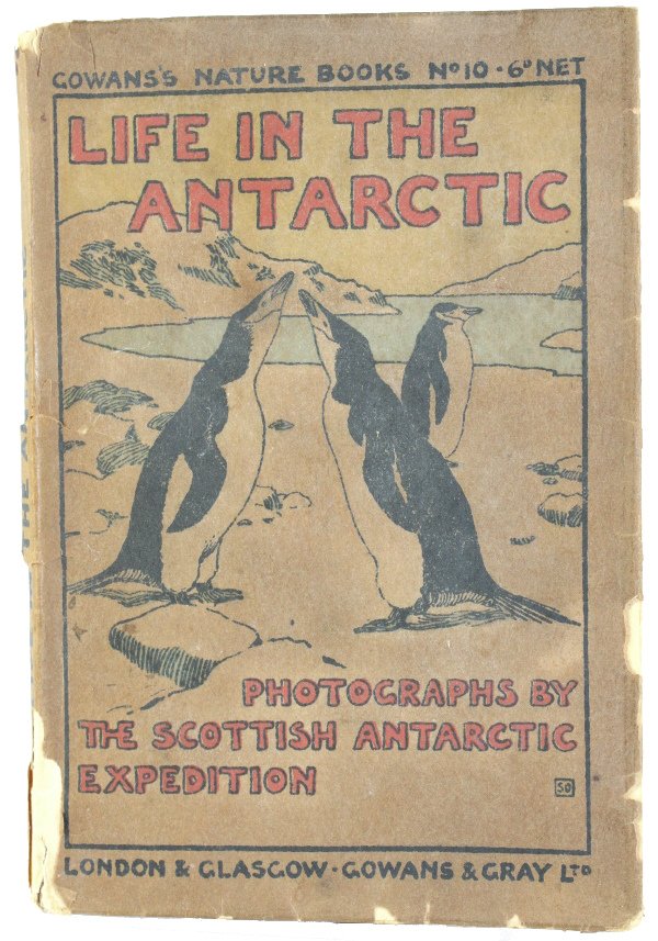 10x14,5cm , [8] (advertising), 67, [5] (advertising). 60 full-page photographs, original colour illustrated parchment paper around stiff wrappers. A charming chapbook issued as Cowan's Nature Books No. 10. Photos show whales, penguins, seals, shags, skuas etc. 4 photos show members of the expedition, one photo shows the Scotia in the background and one photo shows an emperor penguin on board the Scotia. Small portion of the back cover missing but with the illustrated front wrapper largely intact. Scarce