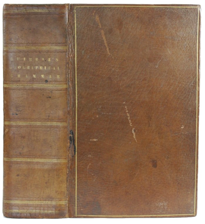 Thick 8vo contemporary full calf with normal wear, gilt, hinges strenghtened. 965 pages with information about countries, explorations etc etc and 24 maps by Russell and an engraving of the armillary sphere. Small tear and 2 tiny stains in world map (40x21 cm), repaired tear on fold in Europe-map. Traces of use but overall nice and clean. |