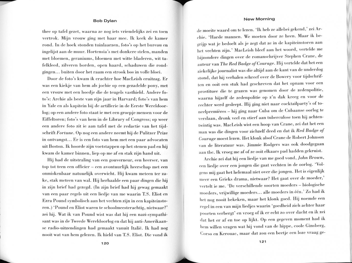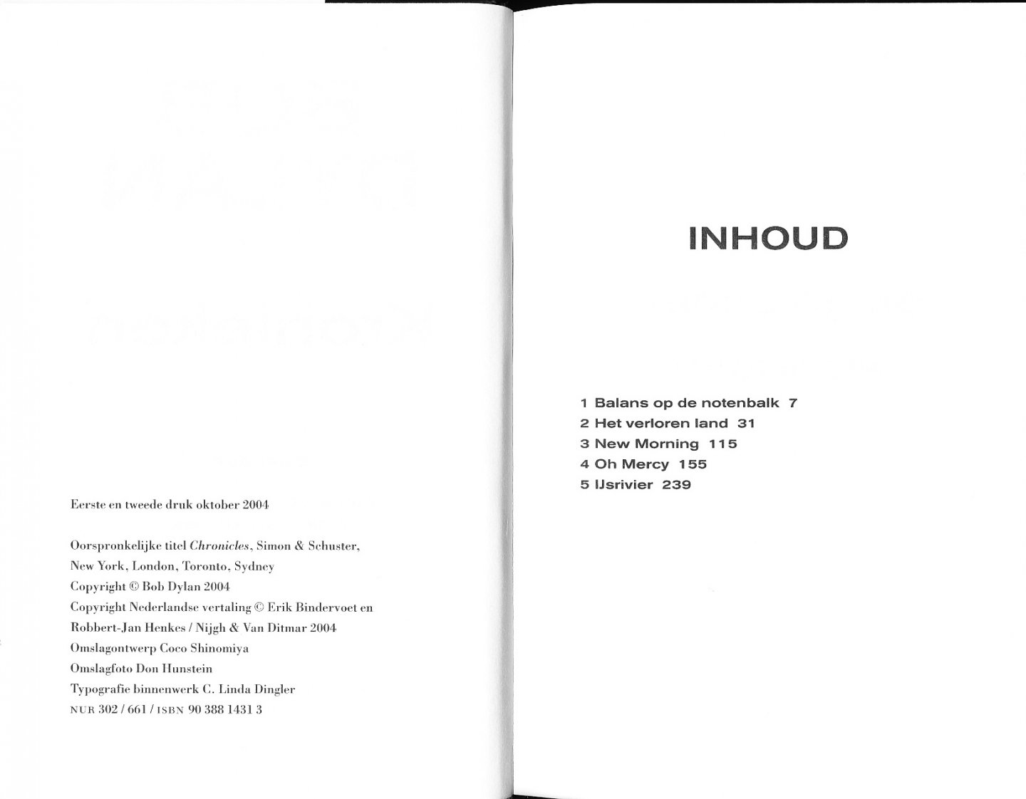 In een filmische, trefzekere stijl voert Dylan de lezer mee naar vijf belangrijke periodes in zijn leven: van zijn eerste dagen in het door sneeuw bedekte New York, hongerig naar succes, maar het Woodstock van de jaren zestig, het magisch centrum van de wereld; van een schamel appartement in Greenwich Village, van waaruit hij de in een razend tempo veranderende tijden waarneemt, tot de euforische dagen in een opnamestudio waar hij samen met Daniel Lanois werkt aan zijn meesterlijke comebackplaat Oh Mercy. Een helder, direct en openhartig verslag.