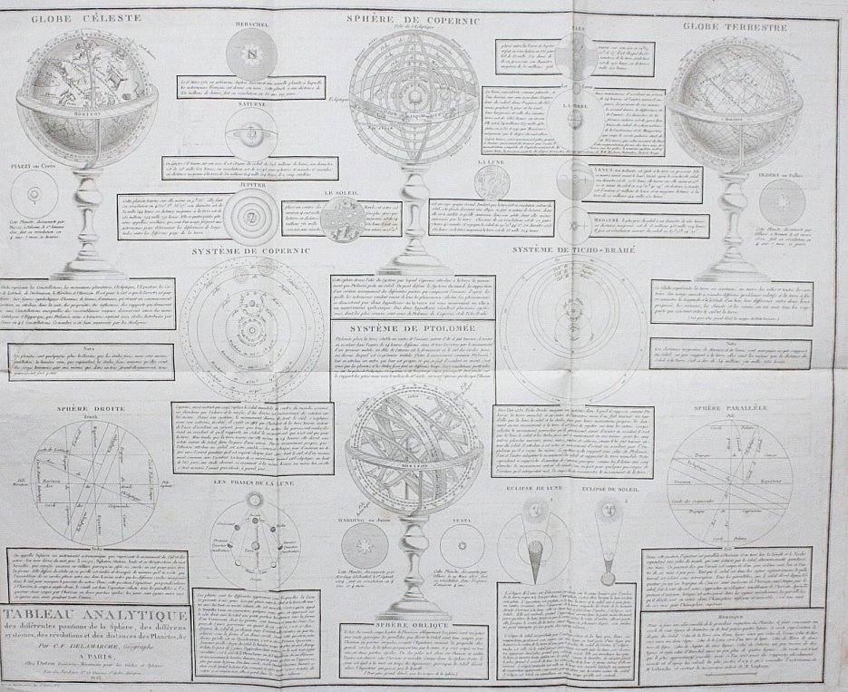 Folio 33 x 26 cm, leather spine, marbled boards with wear and repairs. 34 in stead of 33 double page (or even larger folded) maps (extra: Carte du monde connu des anciens). Contents generally very good and clean. Félix Delamarche, successor of Robert de Vaugondy, was a French geographer and engineer who flourished during the 18th century and early 19th century. Delamarche created the Atlas de la géographie ancienne et moderne in 1820. The atlas was reprinted during the 19th century. It was utilized by the Ecole Spéciale Militaire de Saint-Cyr. |