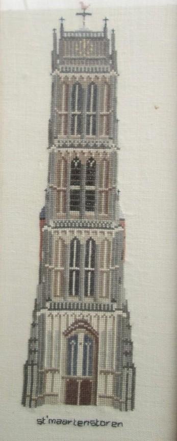 Decoratief borduursel, voorstellende de typische spitsloze toren van de Bommelse Sint-Maartenskerk, een grote basiliek gebouwd in de 15e eeuw; gewijd aan Martinus van Tours en één van de belangrijkste voorbeelden van de Nederrijnse gotiek.