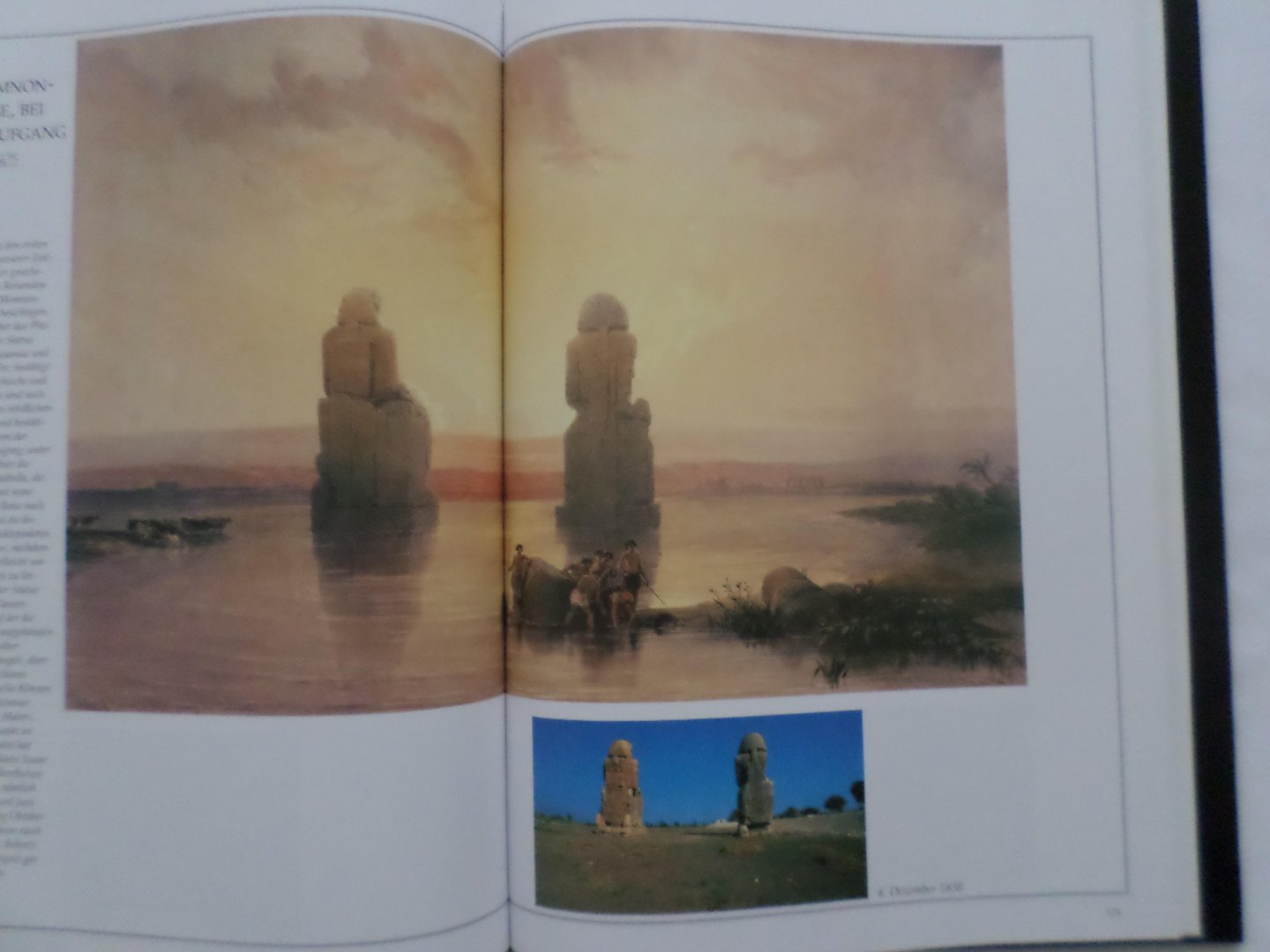 Text: Fabio Bourbon - Fotos: Antonio Attini - Redaktion: Valeria Manferto De Fabianus - Gestaltung: Anna Galliani - Übertragung aus dem Italienischen: Claudia Theis-Passaro. Das Heilige Land, Gestern und Heute - ISBN: 3898930017 - 271 pp. - 26,57 x 34 cm. Text: Fabio Bourbon - Fotos: Antonio Attini - Grafiken: Patrizia Balocco Lovisetti - Übertragung aus dem Italienischen: Annette Matheus. David Roberts (Stockbridge, 24. Oktober 1796 - London, 25. November 1864), war ein schottischer romantischer Maler, der für seine Skizzen der altägyptischen Denkmäler am bekanntesten ist. Nach Reisen in Spanien, Frankreich und Nordafrika wurde Roberts vom alten Ägypten fasziniert. Im August 1838 verließ er London nach Alexandria, wo er am 24. September eintraf. Er hatte die Erlaubnis des britischen Konsuls erhalten, sich frei in Ägypten zu bewegen, und ein Boot gemietet, um den Nil zu segeln. Durch seine scharfe Wahrnehmung zeichnete er sehr präzise Skizzen antiker ägyptischer Denkmäler wie den Tempel von Dendera, den Tempel von Philae, den Tempelkomplex von Karnak, den Luxor-Tempel, das Tal der Könige, den Tempel von Edfu und Abu Simbel. Insgesamt entstanden in ein paar Monaten zweihundertsiebzig Zeichnungen, drei Drehbücher mit Skizzen und einige Panoramen von Kairo. Bücher und Schutzhüllen sind in einwandfreiem Zustand, aber die Kartonkassette ist leicht beschädigt. |