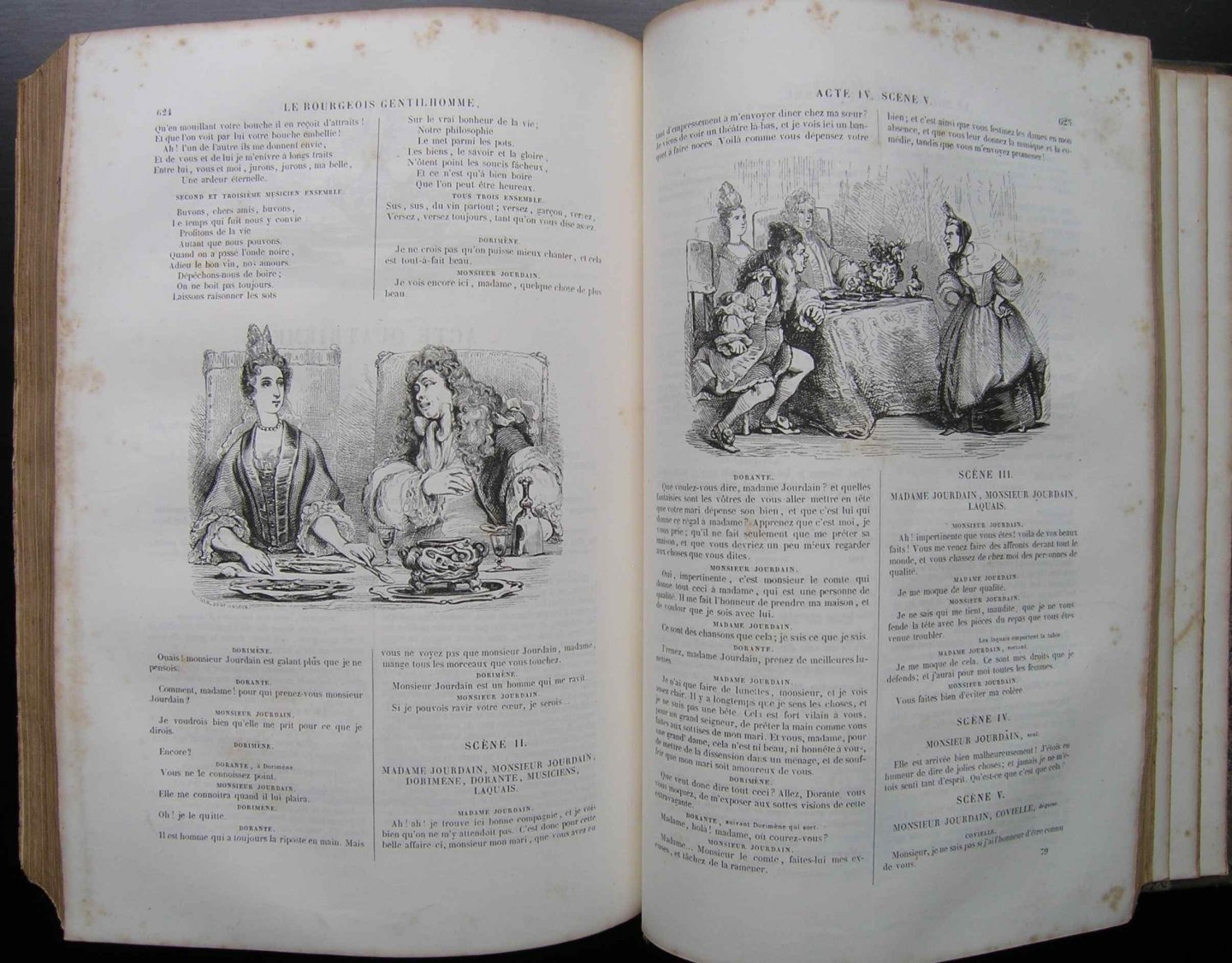 Schitterende, rijk geïllustreerde uitgave van de werken van Molière. De elegante gravures zijn van Tony Johannot (1803-1852), een veel gevraagd kunstnaar/illustrator in zijn tijd.