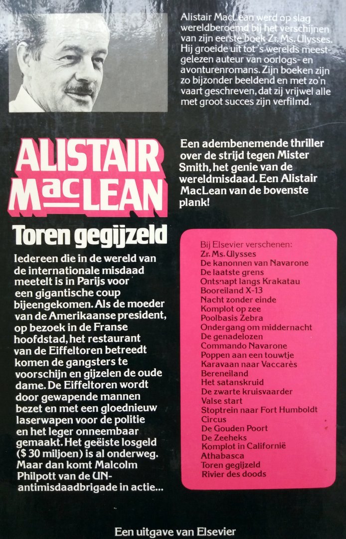 (Elsevier - Amsterdam / Brussel) ISBN 9010043312 uitgave uit 1982 197 pp paperback (ongelezen, pp iets verkleurd) Staat van het boek: 7.5 Parijs. Iedereen die ook maar íéts voorstelt in de internationale criminaliteit is in Parijs bijeen. Als de moeder van de president van de Verenigde Staten, op bezoek in de lichtstad, het restaurant van de Eiffeltoren betreedt, komen de gangsters tevoorschijn en wordt de oude dame gegijzeld... De Eiffeltoren wordt door een legertje gewapende mannen bezet en politie en leger kunnen niets uitrichten. Maar dan komt Malcolm Philpott van de antimisdaadbrigade van de Verenigde Naties in het geweer...Recensie(s)Een internationale gangsterbende heeft zich meester gemaakt van de Eiffeltoren in Parijs en heeft daar meteen de moeder van de Amerikaanse president gegijzeld. De bende beschikt over een totaal nieuw en allesvernietigend laserwapen en eist een som van 30 miljoen dollar van de Franse regering. Uiteraard kan dit niet zo maar en dus komt Malcolm Philpott van de UN-antimisdaadbrigade hiertegen in actie. Onnodig te zeggen dat hij slaagt. Een vlotte, handig gemaakte thriller, zoals dat van deze auteur kan worden verwacht. Normale druk. (Biblion recensie, Redactie) Prijs €2,50 |