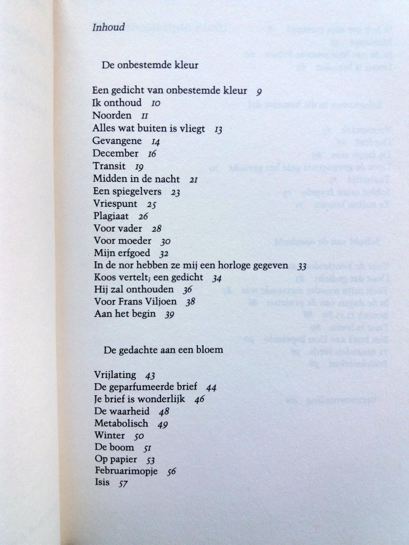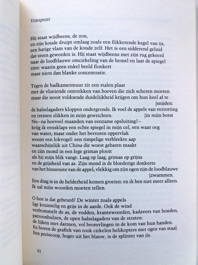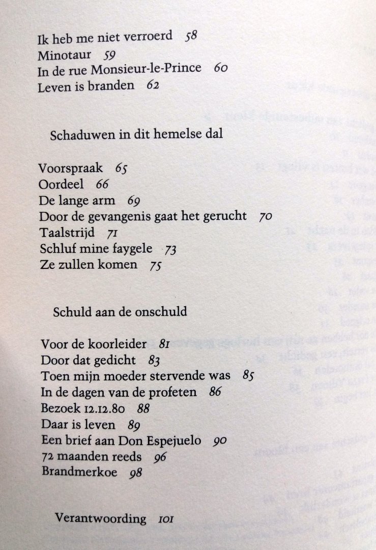 (Gevangenispoezie) (Meulenhoff) ISBN 9029021381 uitgave uit 1987 98 pp paperback (zo goed als nieuw!) Staat van het boek: 9.0 Uit de vijf bundels gevangenispoezie van de Zuidafrikaanse dichter, schilder en prozaist Breyten Breytenbach ('Voetskrif', 'Lewendood', 'Buffalo Bill', 'Eklips', en 'Yk') heeft de uitgever in overleg met de auteur 'De ongedanste dans' samengesteld. Breytenbach schreef deze gedichten in de zeven jaar dat hij gevangen zat wegens ' terroristische activiteiten'. Over deze periode schreef hij ook in proza: 'De ware bekentenissen van een witte terrorist' en 'De andere kant van de vrijheid'. Breytenbachs poezie is niet gemakkelijk, maar kent een grote rijkdom aan oorspronkelijke beelden, waarop zowel de Zuidafrikaanse weelderige natuur als de taal van de Bijbel van invloed is. Inhoudelijk komt vooral het grote contrast tussen een leven in vrijheid en een bestaan in gedwongen gevangenschap naar voren. Breytenbach toont zich hierin een boeiend (zelf)analyticus die niet zonder humor en met gevoel voor de historische dimensies zijn zeer bijzondere ervaringen verbeeldt. Prijs €4,50 |