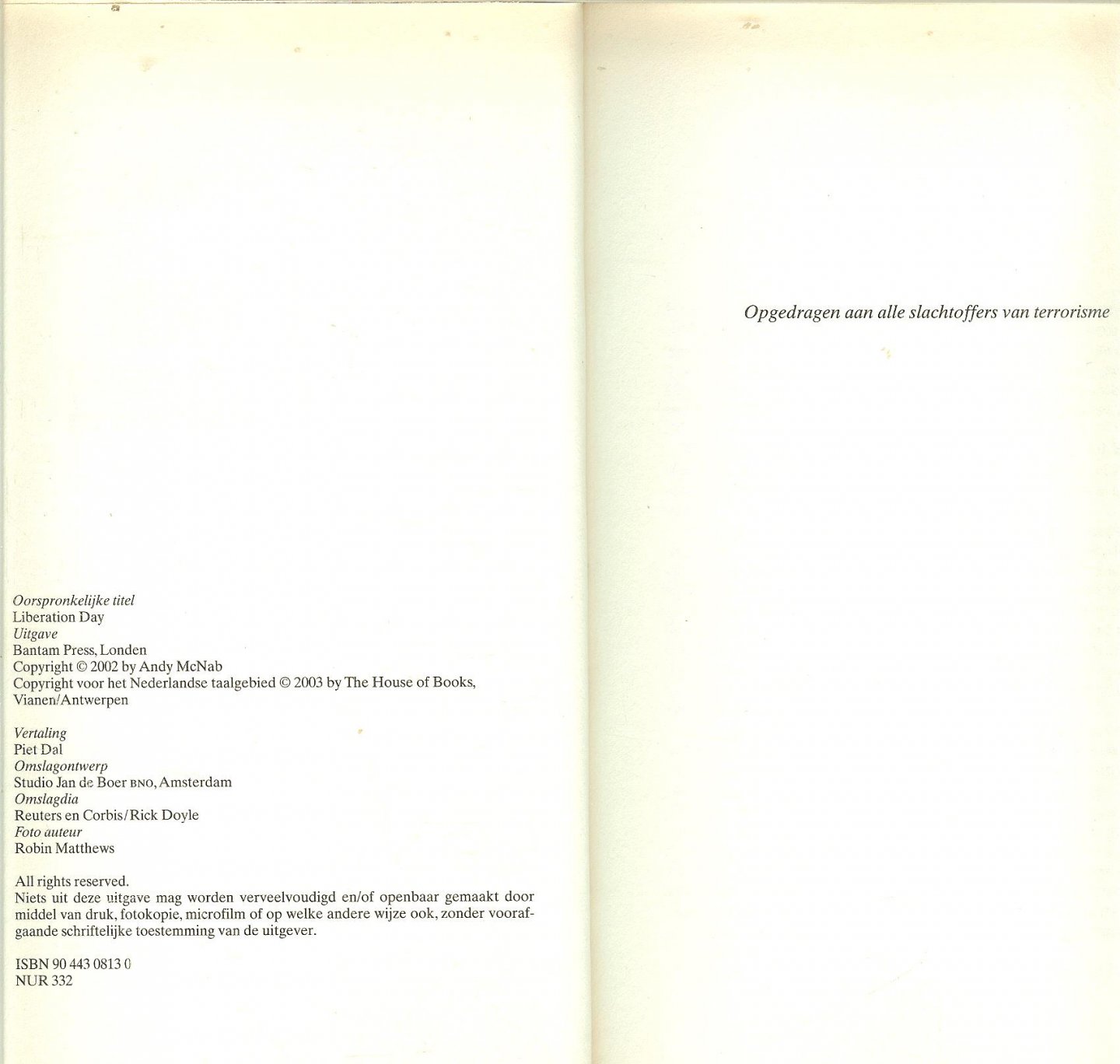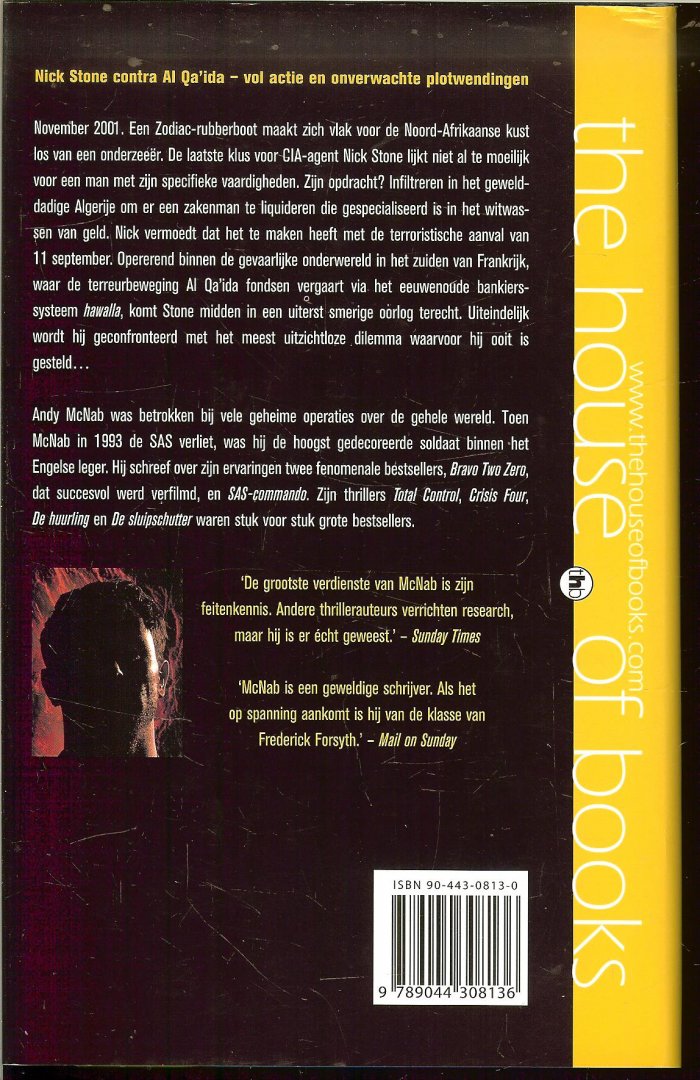 Omslagontwerp Studio Jan de Boer bno te Amsterdam "Bestsellerauteur Andy McNab, bekend van de thrillerreeks rond actieheld Nick Stone, is het pseudoniem van een voormalig Brits Special Air Services-soldaat. Hij werd wereldberoemd toen hij na de Eerste Golfoorlog in 1993 zijn verslag publiceerde van de mislukte SAS-missie Bravo Two Zero. Voor deze missie ontving hij o.a. de Distinguished Conduct Medal. McNab wordt nog steeds wereldwijd gezocht door enkele terroristische organisaties. Het is daarom verboden om afbeeldingen van zijn gezicht, of zijn huidige locatie, te openbaren. |