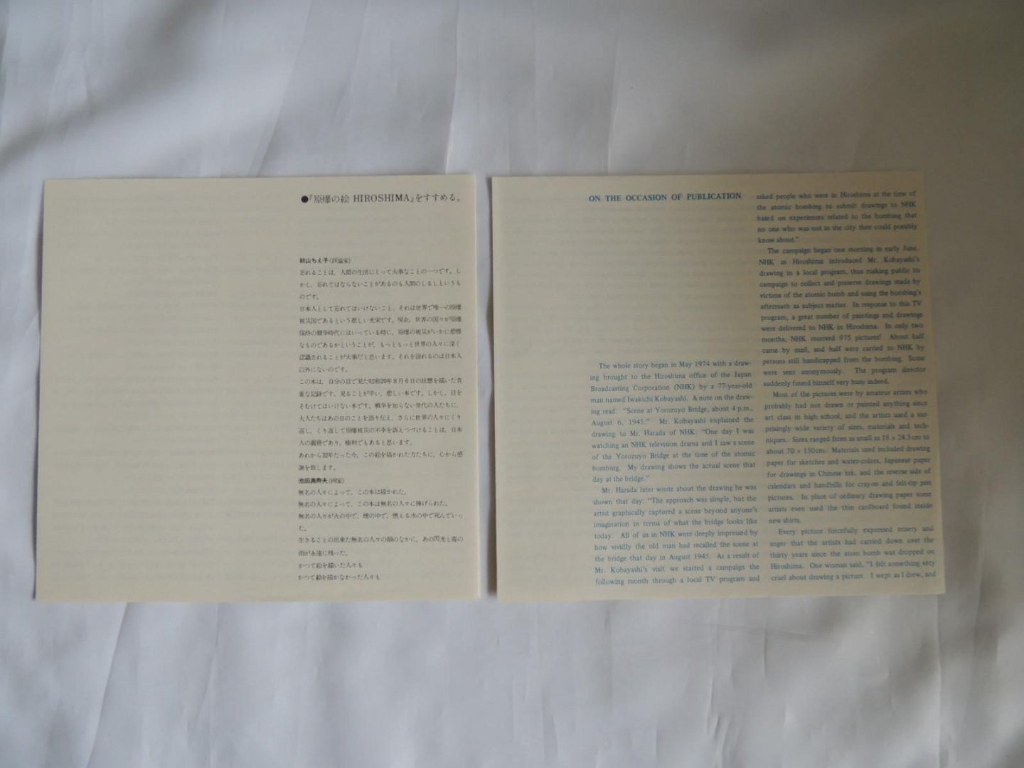 collected after a television broadcast which started with the coming of an old man bringing in a painting of the Yorozuyo Bridge at the time of bombing. so this started to be a historical collection and storys coming in regarding the bombing at Hiroshima. An exhibition and this book are the final results of the NHK. --- a short introduction in English and japanese is inserted ---- |