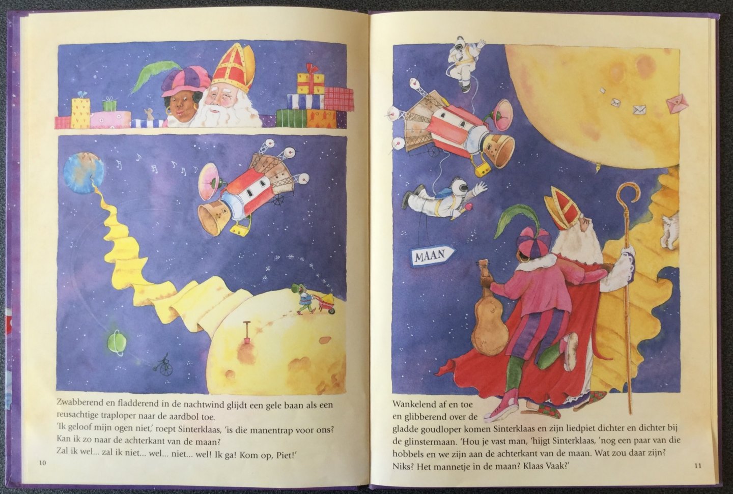 Bij het zien van een vallende ster doet Sinterklaas een wens: hij wil de achterkant van de maan wel eens zien. Dat kan, er komt een lange trap naar de aarde waarlangs Sinterklaas en Piet de maan opklimmen. Ze ontmoeten er de goedlachse Sandra Klazina, die na eeuwen wel eens wil ruilen met Sinterklaas, en naar beneden wil. Ze is elke dag jarig, dus ze heeft cadeautjes genoeg. Maar Sinterklaas krijgt heimwee en daalt weer af. Hij glijdt uit, valt, en wordt in bed wakker. Het was een droom. Wensvervullend verhaal, vooral aantrekkelijk door de blije waterverftekeningen in kleur (soms over een dubbele pagina) waarop veel te zien is, en die soms uitbundig uit het kader springen. Kleuters tekenden maantjes voor de schutbladen.