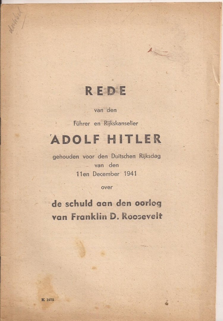 | Titel: | Rede van den Führer en Rijkskanselier Adolf Hitler gehouden voor den Duitschen Rijksdag van den 11en December 1941 over de schuld aan den oorlog van Franklin D. Roosevelt. |