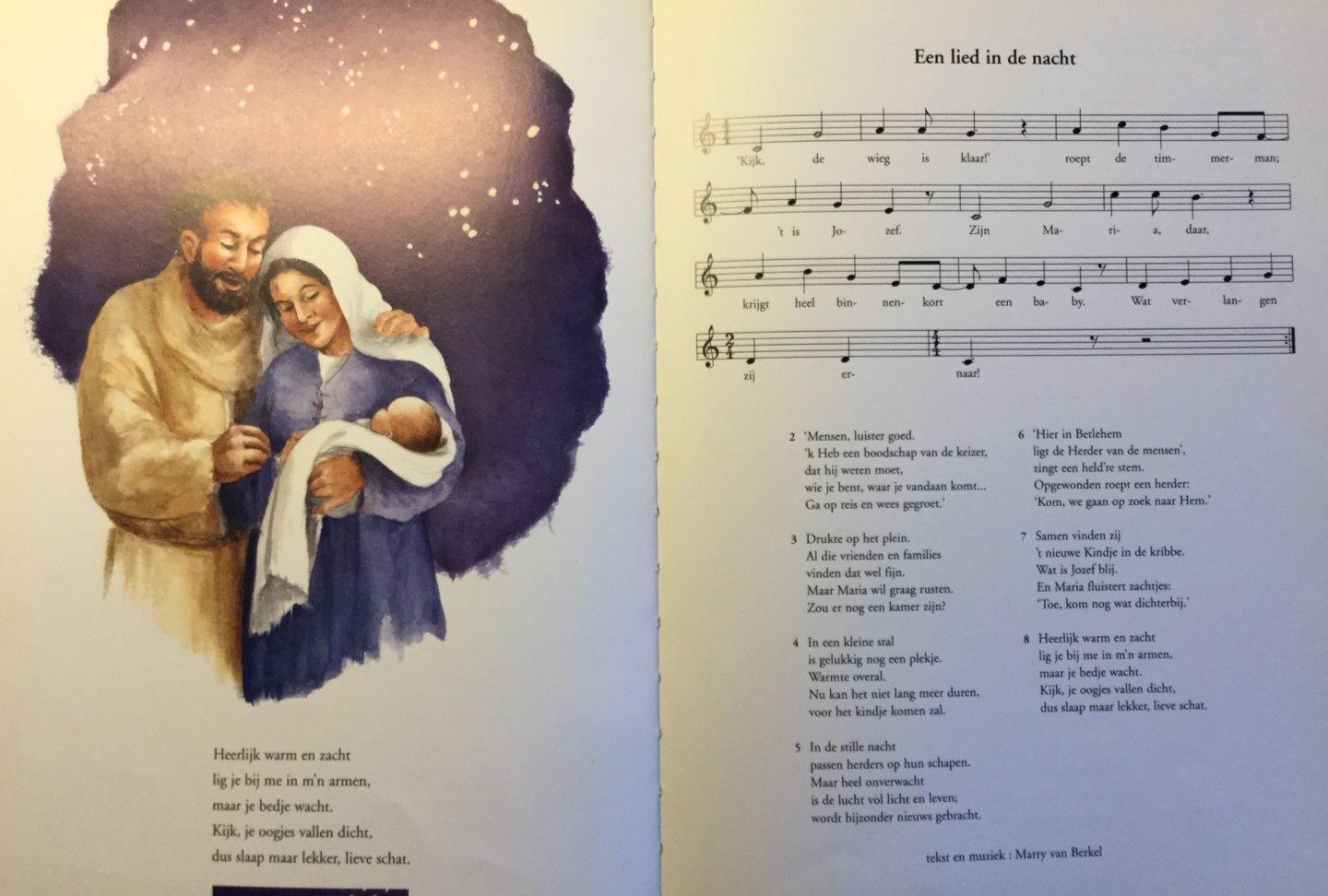 Op de tekst van een (kerst)lied, dat in zijn geheel met muzieknotatie op de laatste bladzijde staat, wordt in dit prentenboek het kerstverhaal verteld.