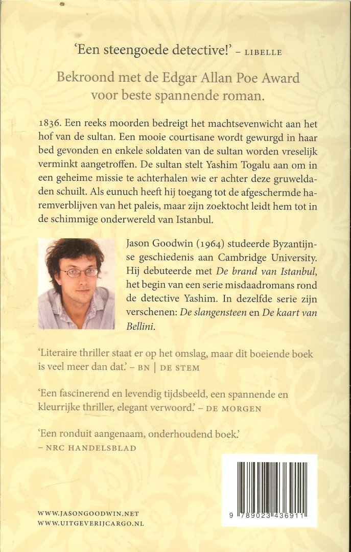 Omslagontwerp Alex Kirby Omslag illustratie Marco Ventura Foto Auteur Jerry Bauer 1836. Een reeks moorden bedreigt het machtsevenwicht aan het hof van de sultan. Een mooie courtisane wordt gewurgd in haar bed gevonden en enkele soldaten van de sultan worden vreselijk verminkt aangetroffen. De sultan stelt Yashim Togalu aan om in een geheime missie te achterhalen wie er achter deze gruweldaden schuilt. Als eunuch heeft hij toegang tot de afgeschermde haremverblijven van het paleis, maar uiteindelijk leidt zijn zoektocht hem naar de schimmige onderwereld van Istanbul. |