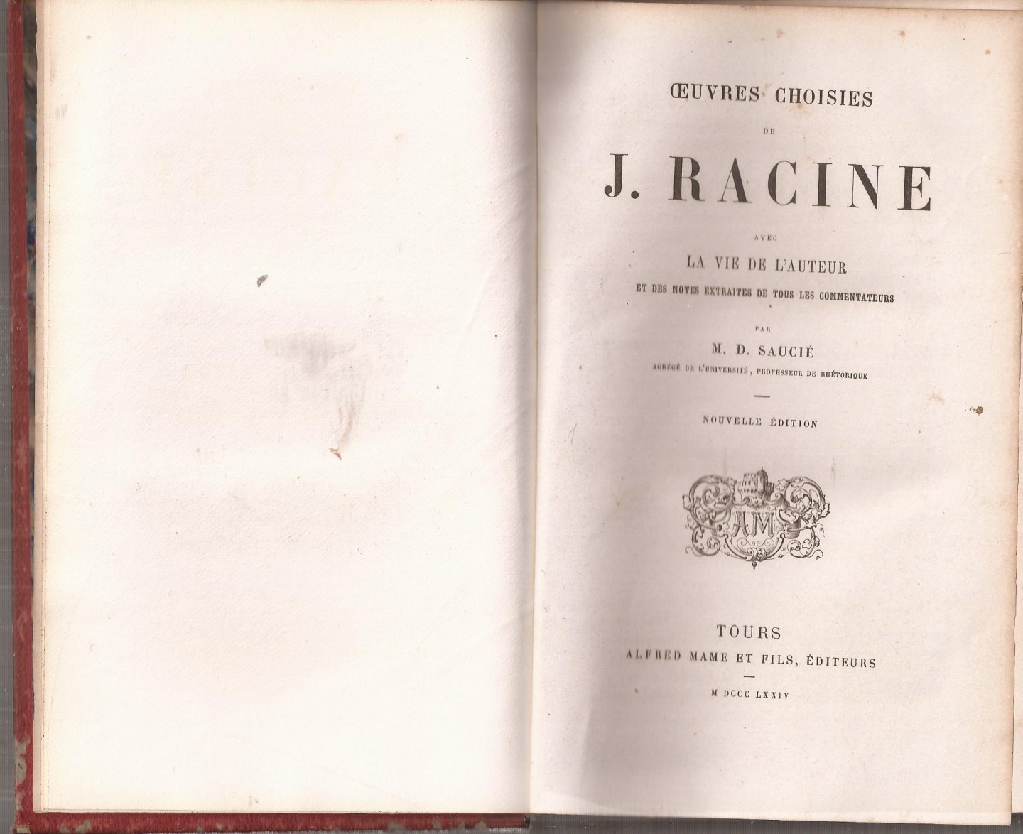 | Titel: | Oeuvres Choisies de J. Racine avec la Vie de l'Auteur et des notes extraites de tous les commentateurs, par M. D. Saucié. |