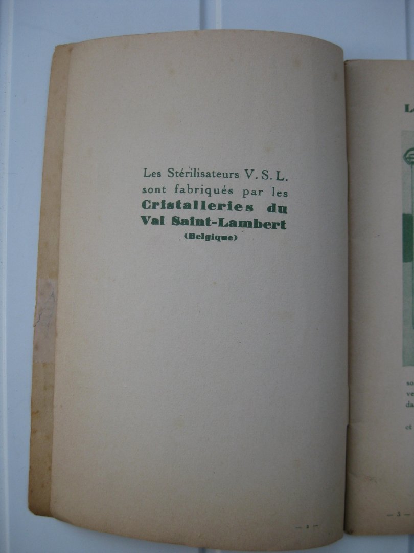 | Meer info: | Les stérelisateurs V.S.L. étaient fabriqués par les Cristalleries du Val Sant-Lambert (Belgique). |