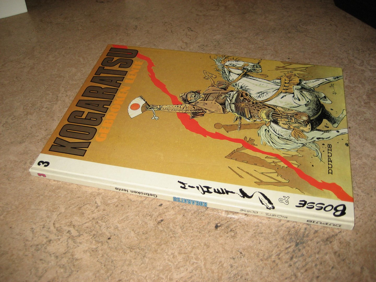 Japan,geschiedenis / In dit met enige moeite wel zelfstandig te lezen vervolg op "De schat van de Eta" (a.i. 87-04-123-5) gaat de jonge samoerai Kogaratsu verder met zijn tegen een wrede heerser gerichte daden. Het verhaal zit volop spanning en is hier en daar nogal gewelddadig voor een uit het stripweekblad Robbedoes afkomstig verhaal. Het gebeuren speelt in 1611 op het eiland Hokkaido en geeft een aardig betrouwbaar beeld van die tijd. Zo is het met positief resultaat gebruiken van haakbussen tegen ruiterij historisch juist; de slag bij Sekigahara in 1600 werd ook zo gewonnen. Ook voor niet-kenners van Bushido (samoerai-code) wordt de wat op de achtergrond gehouden innerlijke tweestrijd van de hoofdpersoon tussen eigenmachtig handelen en Giri (plicht) om de zoon van zijn vermoorde meester te volgen duidelijk. Het geheel wordt verteld in filmisch ingedeelde pagina's met veel oog voor details. De inkleuring van Janet Gale, de vriendin van de nieuwe tekenaar van Blueberry, Colin Wilson, geeft de realistische tekeningen een extra mee. Vanaf ca. 14 jaar.