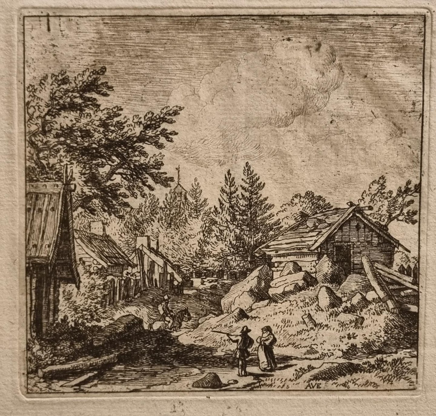 | Bijzonderheden: | View of wooden houses on either side of a path with large boulders.In the foreground a man and a woman, a little further another man on a horse. Signed at bottom: 'AVE'. |