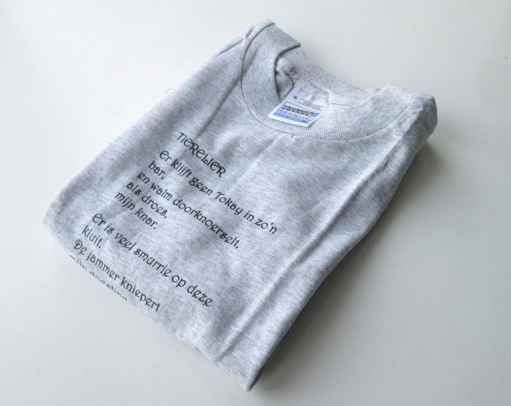 Screenstars T-shirt van Fruit of the Loom met gedicht van Querulijn Xaverius Markies de Canteclaer van Barneveldt in zwarte zeefdruk. Tekst gezet uit de Harrington en afkomstig uit de bundel Vleugeljaren (1989) met portret van de dichter. Bij de verpakking hoort een kaartje met Wasvoorschrift van de uitgever.