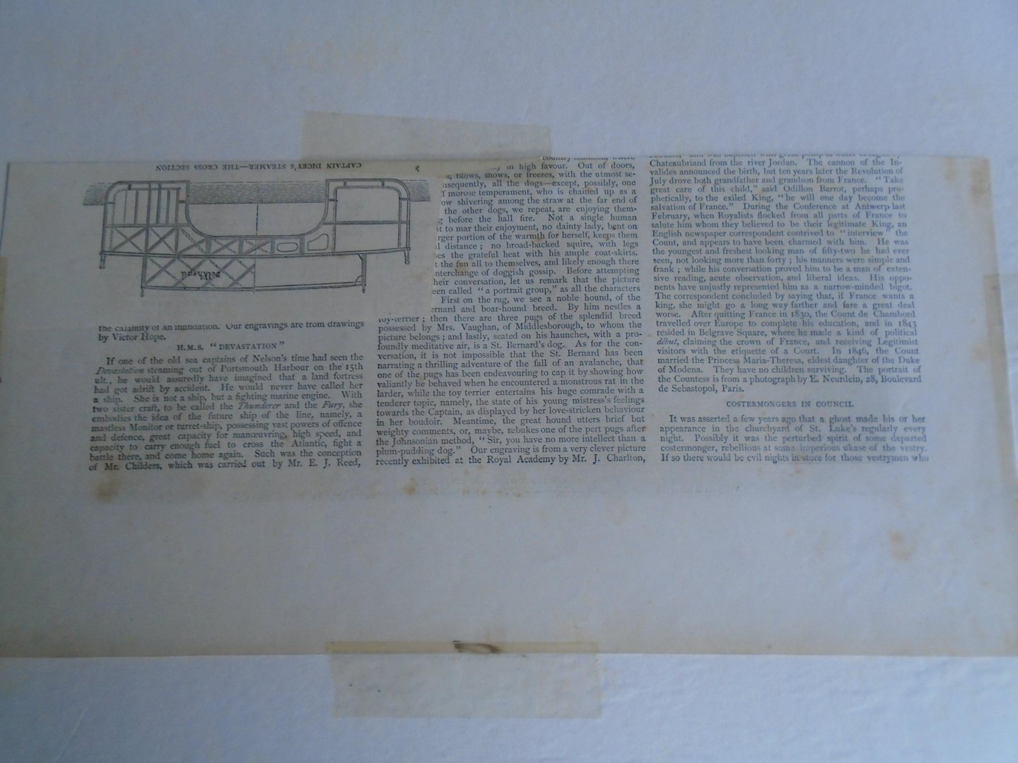 | Titel: | . Channel Crossing .Captain Dicey,s Steamer. A ship cut in halves from stern to stern, the two halves united by girders, the paddle-boxes in the middle, and over the girders a spacious deck |
