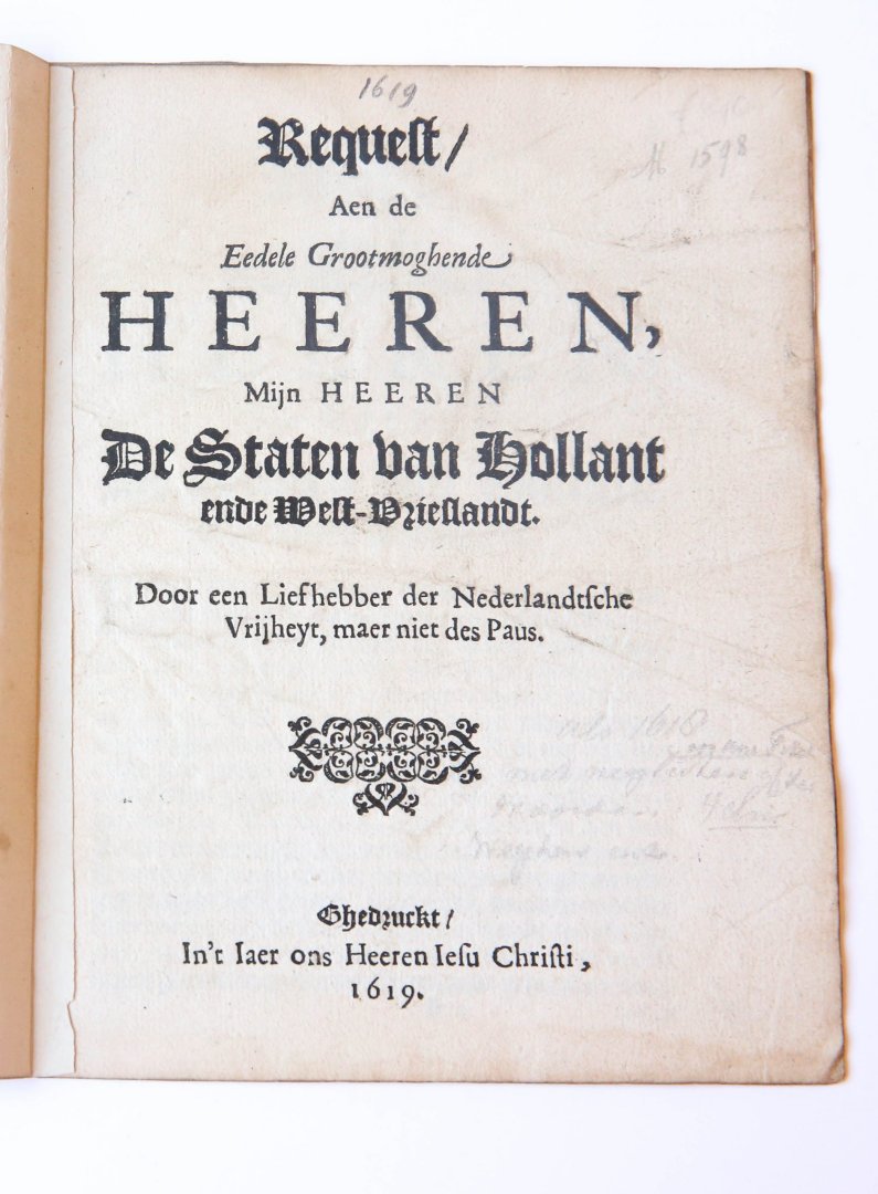 | Titel: | Pamphlet. Request, aen de eedele grootmoghende heeren, mijn heeren De Staten van Hollant ende West-Vrieslandt, 1619, 8 pp. |