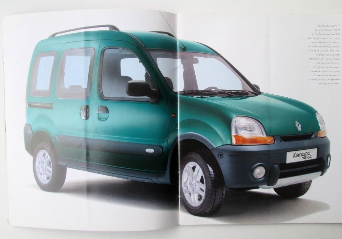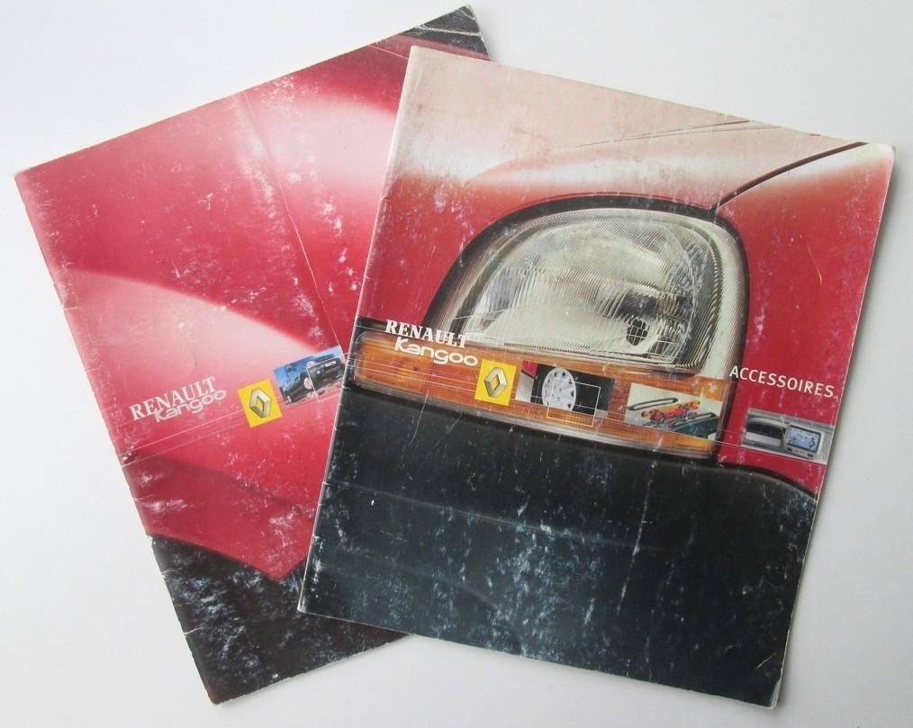 Brochures met reclame voor de Renault Kangoo (bouwjaar 2002) en Accesoires (2001). Geïllustreerd met foto's en (bouw-) tekeningen in kleur van exterieur en interieur. Met losse prijslijst in guldens en euros.