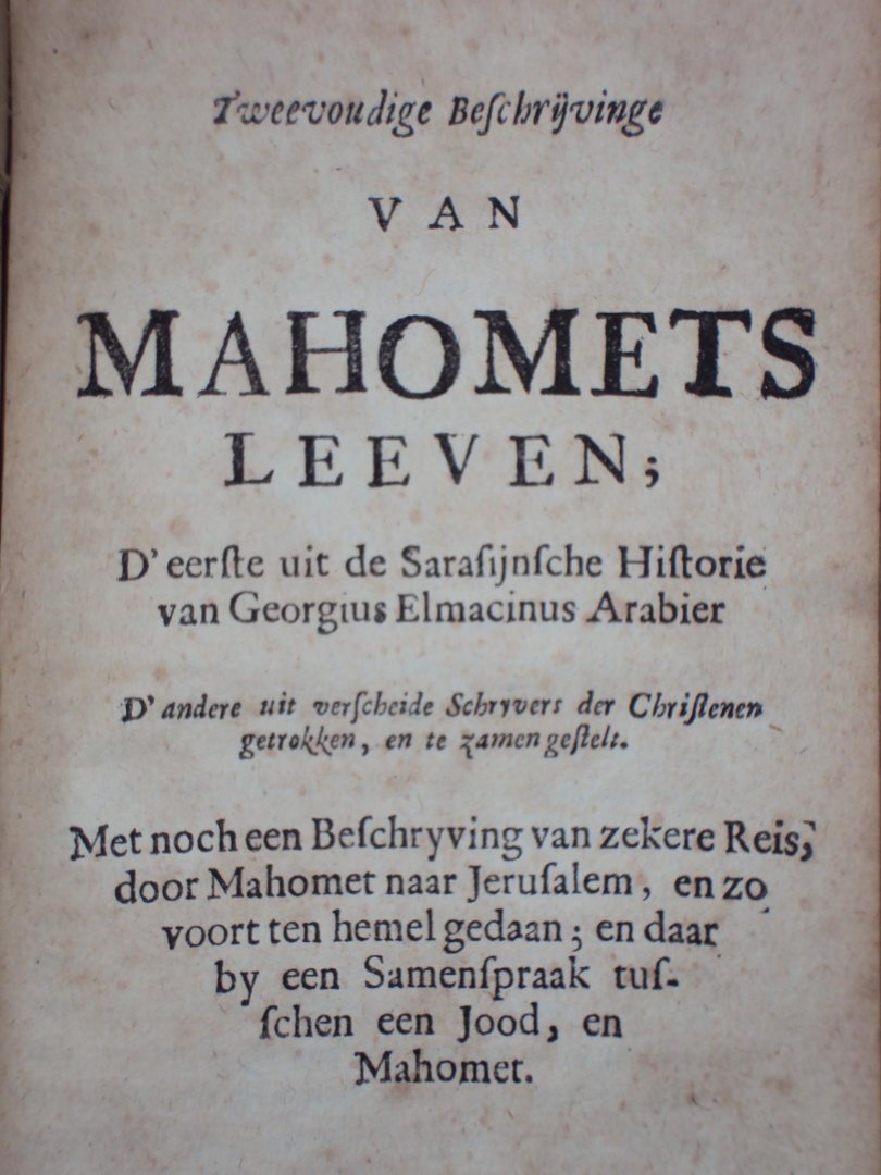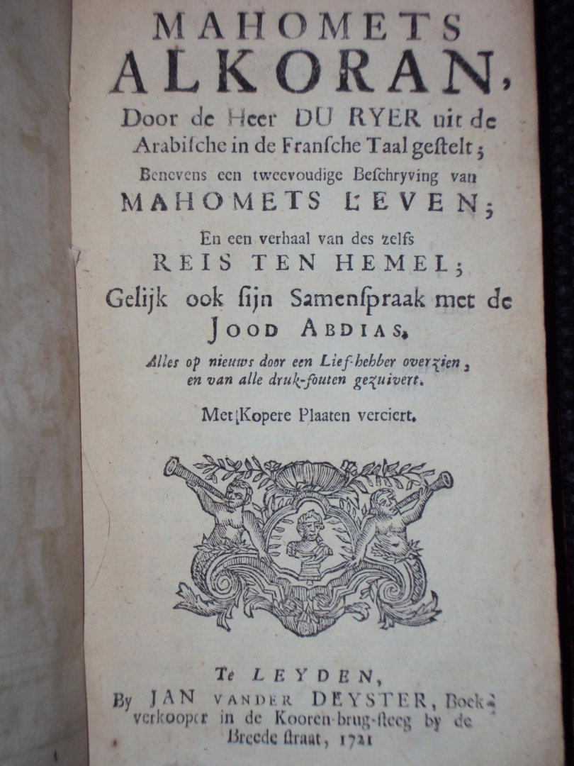 Mahomets Alkoran, benevens een tweevoudige beschrijving beschyving van Mahomets Leven; En een verhaal van des zelfs reis ten hemel; Gelijk ook sijn samenspraak met de Jood Abadias - Leyden, Jan vander Deyster, 1721 - (12),547,(1) pp - leather - 17 x 10,5 cm