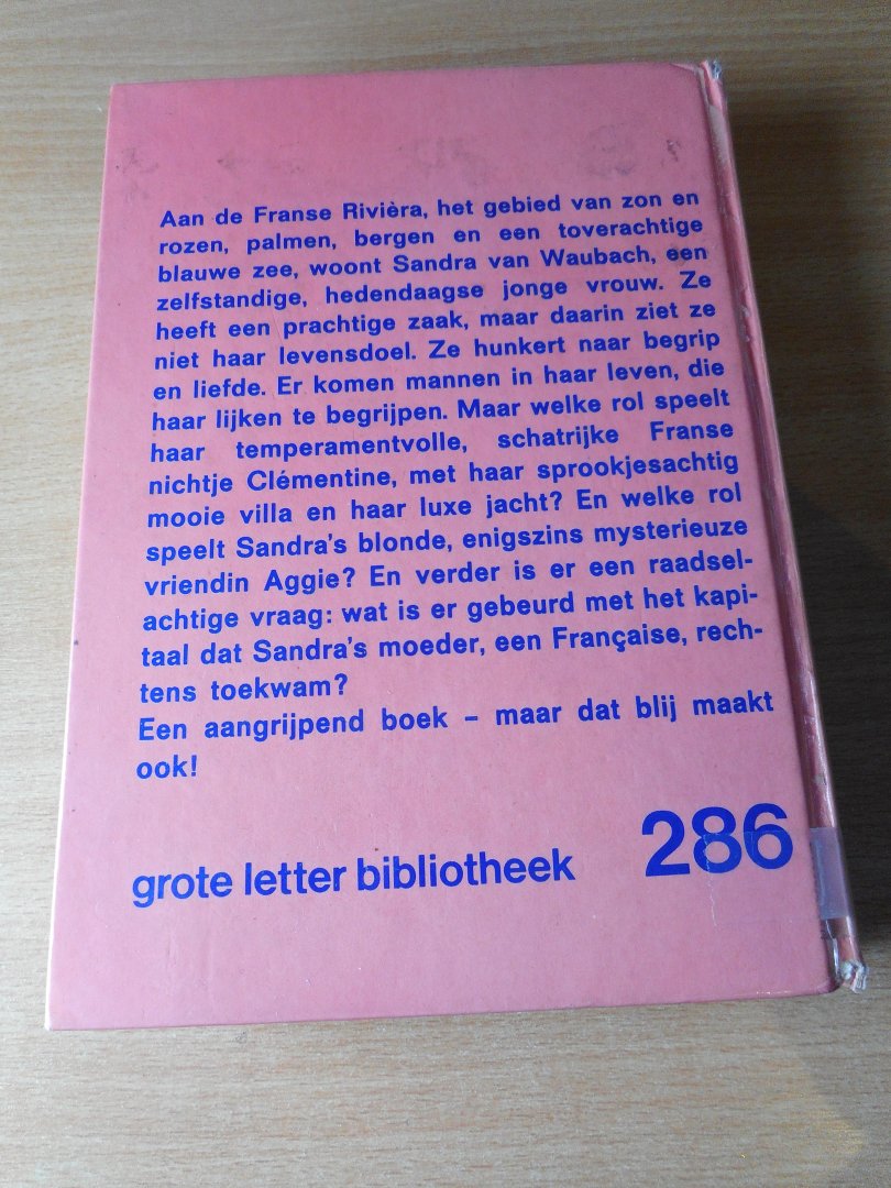 | Bijzonderheden: | Afgeschreven biebboek uit een verzorgingstehuis. Wat gebruikerssporen, een stempel en lichte verkleuring zichtbaar. Lichte waterschade aan laatste bladzijden. Goed leesbaar. Grootletterboek. |
