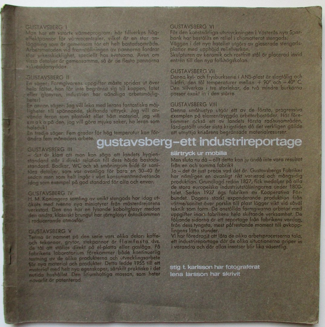 Karlsson, S. T. and Larsson, L. - GUSTAVSBERG-ETT INDUSTRIEREPORTAGE särtryck ur mobilia - Special edition MOBILIA n° 137 - December 1966