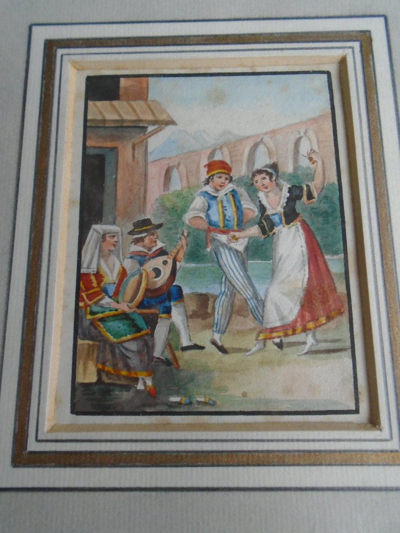 | Titel: | Aquarel, Italiaans. Dansend paartje met twee muzikanten . Een fijn gekleurd tafereeltje |