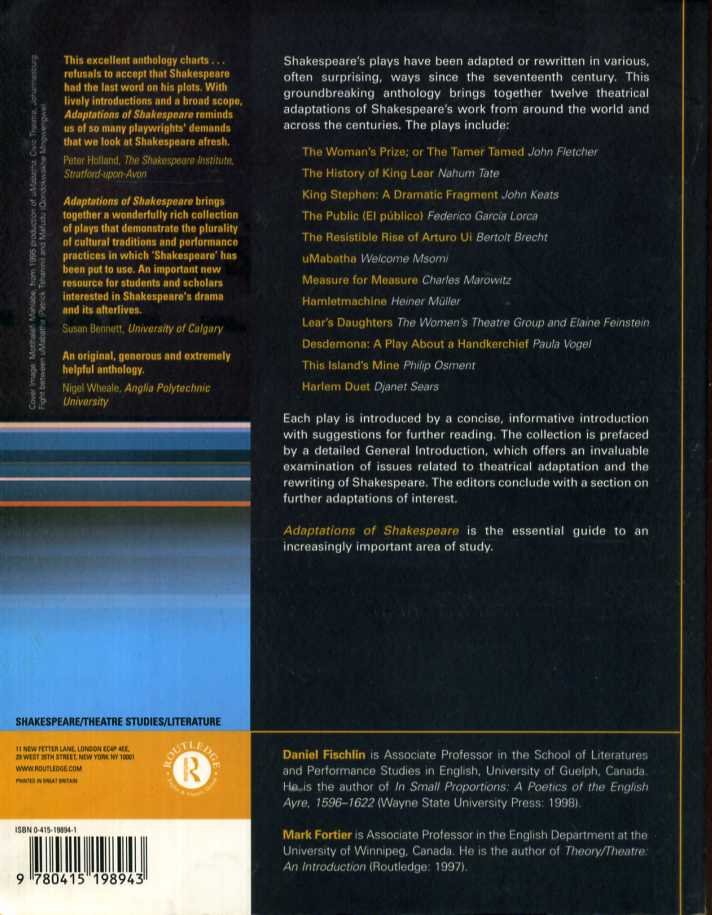 Shakespeare's plays have been adapted or rewritten in various, often surprising, ways since the seventeenth century. This groundbreaking anthology brings together twelve theatrical adaptations of Shakespeares work from around the world and across the centuries.