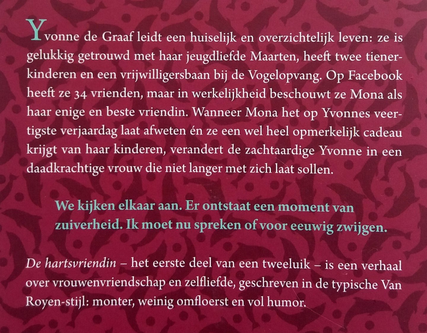 (Lebowski) ISBN 9789048817955 uitgave uit 2013 283 pp hardcover gebonden met stofomslag (zo goed als nieuw!) Staat van het boek: 9.0 Een roman over vrouwenvriendschap en zelfliefde, geschreven in de typische Van Royen-stijl: monter, weinig omfloerst en vol humor. Yvonne de Graaf is gelukkig getrouwd met haar jeugdliefde Maarten, heeft twee tienerkinderen en een vrijwilligersbaan bij de Vogelopvang. Op Facebook heeft ze 34 vrienden, maar in werkelijkheid beschouwt ze Mona als haar enige en beste vriendin. Wanneer Mona het op Yvonne’s veertigste verjaardag laat afweten én ze een wel heel opmerkelijk cadeau krijgt van haar kinderen, verandert de zachtaardige Yvonne in een daadkrachtige vrouw die niet langer met zich laat sollen. Prijs €4,50 |