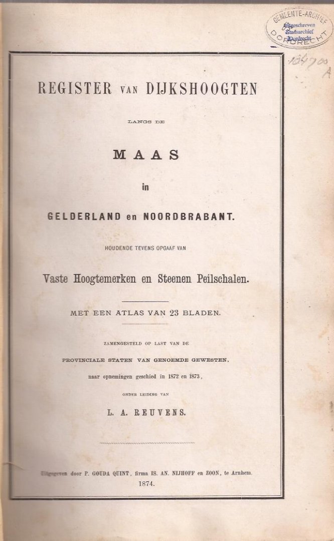 Hierbij: Reuvens, L.A. - Graphische voorstelling van de Waterkeerings-hoogte der Maasdijken van de Geldersche en Noordbrabantsche Polderdistricten en Polders, volgens de uitkomsten der opnemingen van 1872 en 1873, vervat in het daarvan in 1874 uitgegeven Register. Zamengesteld ingevolge besluiten van de Collegien van Gedeputeerde Staten van Gelderland en Noordbrabant. Arnhem, P. Gouda Quint / firma Is. An. Nijhoff en Zoon, 1877. Kl. folio, leporello( 26 bladen) Ex Bibl. Gem. Archief Dordecht Auteur: Louis Abraham Reuvens (1824-1897) Staat: Gebruikssporen Gelderland, noord brabant , maas , waterstaat , dijken , waterhuishouding |