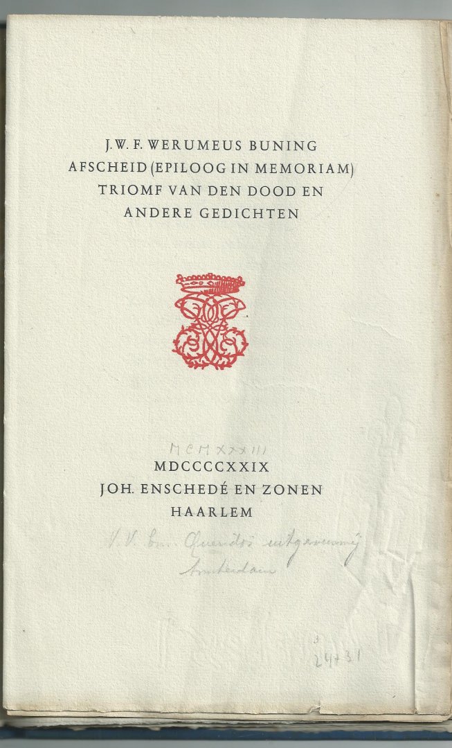 Bijzonder exemplaar van een typografisch belangrijk boek. De binding is grotendeels verbroken (losbladig) en het linnen slijt door op de knepen. Op de titelpagina is de uitgever met een oud handschrift in potlood doorgestreept en er is bijgeschreven: 'V.V. bv. Querido's uitgeverij Amsterdam'. Boven de datering MDCCCCXXIV (1929) is geschreven 'MCMXXXIII' (1933). In het colofon is 'nieuwe' doorgestreept: de Romein is dan (in 1933) niet nieuw meer, en komt bekend te staan onder de naam Romanée (http://home.wxs.nl/~johnf/home.html#1929 - Preliminary Checklist. The early work of Jan van Krimpen). Verder is er een streep gezet door de inhoudsopgave en zijn hier en daar paginanummers bijgeschreven. Het heeft er alle schijn van dat dit exemplaar (in een gelimiteerde oplage van 115 exemplaren verschenen) is gebruikt voor de voorbereiding van een herdruk bij uitgeverij Querido. Daar verschijnt in 1933 'Et in Terra' van Werumeus Buning, eveneens in gelimiteerde oplage - in een ander font -, waarin de gedichten uit de onderhavige bundel ook zijn opgenomen. Hiervan verschijnt in 1934 ook nog een 2de druk. De 2de uitgebreide druk uit 1933 wordt meegeleverd.