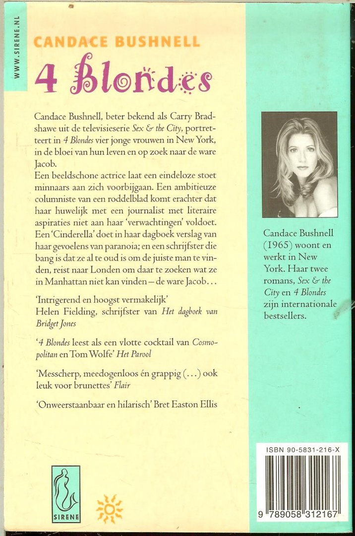 Foto voorzijde omslag Marc Balet Candace Bushnell, bekend door haar columns/boek/tv-serie 'Sex and the city', over trendy New Yorkse vrouwen in de jaren '90, portretteert in '4 Blondes' opnieuw op cynische wijze vier jonge New Yorkse vrouwen en hun lifestyle. Dertigers, intelligent, aantrekkelijk, en al netwerkend verbeten op jacht naar status, carriere, en/of de ideale man, waarbij seks een belangrijk wapen is. Zo neemt Janey Wilcox in het verhaal 'Coupe soleil' iedere zomer een nieuwe rijke minnaar zodat ze haar zomer in het trendy vakantieoord de Hamptons kan doorbrengen. Niet moeilijk, want 'Er was in New York niet een rijke man die er problemen mee had zich geheel vrijblijvend te laten pijpen en in het gezelschap van een leuke vrouw te verkeren'. Verder verhalen over een anorexia prinses, een door ambities verteerde journaliste en een sekscolumniste wanhopig op zoek naar een man. Bijzonder amusante en intrigerende verhalen die een satirische en vlijmscherpe zedenschets geven van het leven in Manhattan. Bushnell heeft inmiddels een contract voor twee boeken over Janey Wilcox en drie van deze verhalen worden voor televisie bewerkt. Kleine druk. |