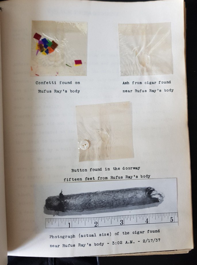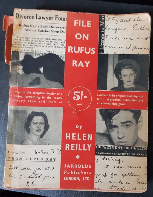 Op AbeBooks 286 $ https://www.abebooks.com/first-edition/File-Rufus-Ray-REILLY-Helen/22808776650/bd New York: William Morrow & Company. 1937. 4to. Original stiff card wrappers, bound with brown ribbon; unpaginated, with pages of newsprint typescript, photographs, physical evidence e.g. a button, confetti, cigar ash mounted in clear plastic; the sealed section containing the solution has been opened but re-sealed with paper-clips; a little chipping to edges, occasional browning, very good. First edition. Crimefile Number 2. An extraordinary game of whodunnit - a whole dossier of evidence that leads to the perpetrator of a horrible murder - as long as the reader can unpick the clues! |