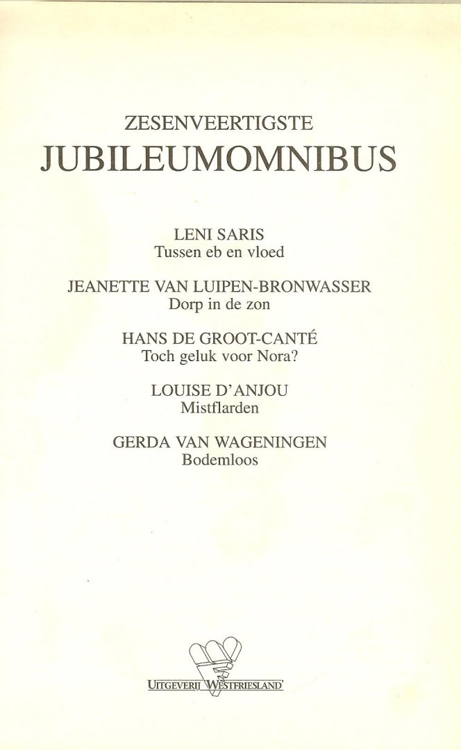 Ook deze Zesenveertigste jubileumomnibus staat garant voor wederom een aantal uitstekende romans. We beginnen met de roman Tussen eb en vloed door bestsellerauteur Leni Saris, gevolgd door het fraaie 'Dorp in de zon' van Jeanette van Luipen-Bronwasser en de vlotte familieroman 'Toch geluk voor Nora?' van Hans de Groot-Canté. Louise d'Anjou vervolgt met de mysterieuze vertelling 'Mistflarden', terwijl Gerda van Wageningen deze omnibus besluit met een kort verhaal, getiteld 'Bodemloos.