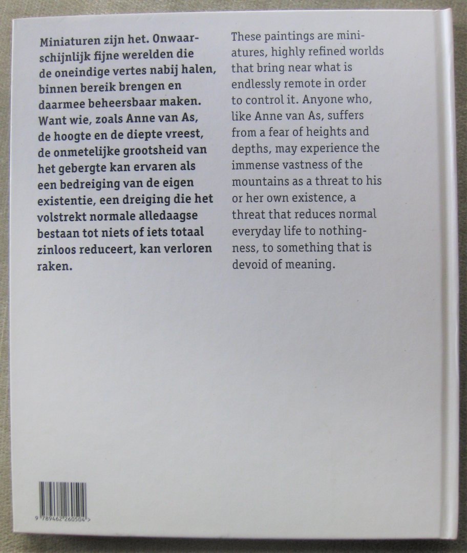 De miniaturen van Anne van As tonen koele berglandschappen, wilde planten en prooidieren. In haar minuscule schilderijen komen het onmetelijke en ongrijpbare binnen handbereik. De wereld wordt klein en beheersbaar. Of is dat schijn? De beelden die ons gewoonlijk zo vertrouwd en onschuldig voorkomen, hebben iets onheilspellends.