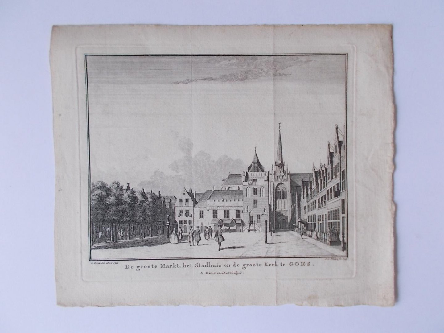 | Titel: | GOES - De groote Markt, het Stadhuis en de groote Kerk te Goes. Kopergravure uit 1745. Tekenaar C. Pronk. Graveur: J.C. Philips. |