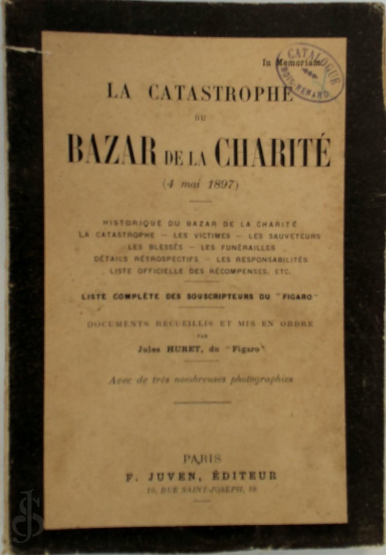 La catastrophe du Bazar de la charit (4 mai 1897): historique du Bazar de la charit , la catastrophe... / documents recueillis et mis en ordre par Jules Huret, ...\nDate de l' dition originale: 1897\nSujet de l'ouvrage: Bazar de la Charit (Paris) -- Incendie (1897)\nLe pr sent ouvrage s'inscrit dans une politique de conservation patrimoniale des ouvrages de la litt rature Fran aise mise en place avec la BNF.\nIls n'en appartiennent pas moins l'histoire des id es en France et sont susceptibles de pr senter un int r t scientifique ou historique.\nLe sens de notre d marche ditoriale consiste ainsi permettre l'acc s ces oeuvres sans pour autant que nous en cautionnions en aucune fa on le contenu.