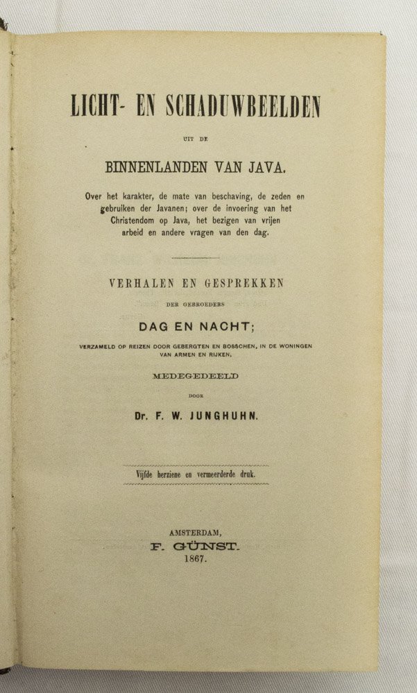 'Frans Wilhelm Junghuhn, Mansfeld (Pruisen) 1809 - Lembang (Priangan) 1864. Hij was de zoon van Wilhelm Friedrich Junghuhn, chirurgijn en barbier, en Christine Marie Schiele. Op 23 januari trad hij in het huwelijk met Johanna Louisa Frederika Koch, met wie hij een zoon kreeg. Schreef onder het pseudoniem Gebroeders Dag en Nacht. Met zijn Licht- en schaduwbeelden uit de binnenlanden van Java (Leiden 1854) is Junghuhn de geestelijke vader van de Nederlandse georganiseerde vrijdenkerij. Het boek is opgezet als een tijdens een reis op Java gevoerd gesprek tussen Dag, Morgenrood, Avondrood en Nacht. De drie eersten verwierpen de godsdienst en redeneerden wetenschappelijk, de vierde deed vergeefse pogingen het christendom te verdedigen met culturele en maatschappelijke argumenten. (...) Junghun vertolkt een opvatting die dicht tegen het pantheïsme staat. Het ging hem erom aan te tonen 'dat de natuur de onuitputtelijke bron van alle waarheid, de eenige goddelijke openbaring is, waaruit de mensch alle gevolgtrekkingen kan afleiden, die geschikt zijn om zijn geest en hart te veredelen en zijn verstand te oefenen, te verlichten en te volmaken'. Hij keerde zich met grote felheid tegen de invoering van het christendom in Indonesië. (...) Het boek verscheen in 1854 eerst in afleveringen onder pseudoniem. De van alle kanten aangevallen uitgever Jacobus Hazenberg durfde er na de eerste aflevering niet mee door te gaan. Het boek werd vervolgens door Frans Günst uitgegeven'. Biografisch woordenboek van het socialisme en de arbeidersbeweging in Nederland. Amsterdam, 1998, 7, 102-105. NNBW, 4, 820-22. Zie ook: Rob Nieuwenhuys. Oost-Indische spiegel. Amsterdam, 1972, 107-118