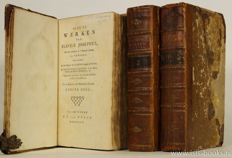 Titel: Alle de werken van Flavius Josephus. Naar het Grieksch in 't Engelsch gebragt en verkort, waar by gevoegd is: De twee boeken van Josephus tegen Appion; Zyn richtsnoer der reden, of het martelaarschap der Macchabeen, en 't gezantschap van Philo...