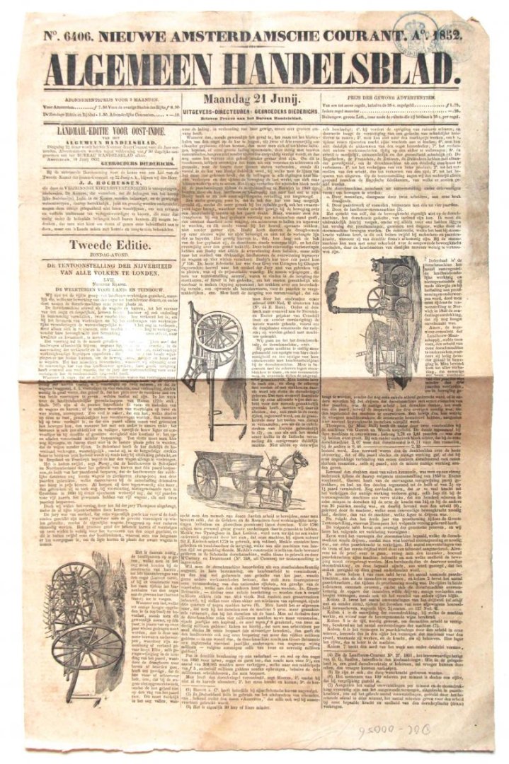 'Nieuwe Amsterdamsche Courant; Algemeen Handelsblad'. General Trade Journal (Nieuwe Amsterdamsche Courant; Algemeen Handelsblad), nr. 6406, Monday June, 21th 1852. This edition is about the exposition of the diligence of all the nations in the world accompanied by drawings about the equipment for agriculture and horticulture. There is also a section of foreign news from England, Germany and France. l Measurements: 485 x 305 mm. Condition: Age-related discolouration, foxing, a couple of folds with a few smudges which have damaged the paper.