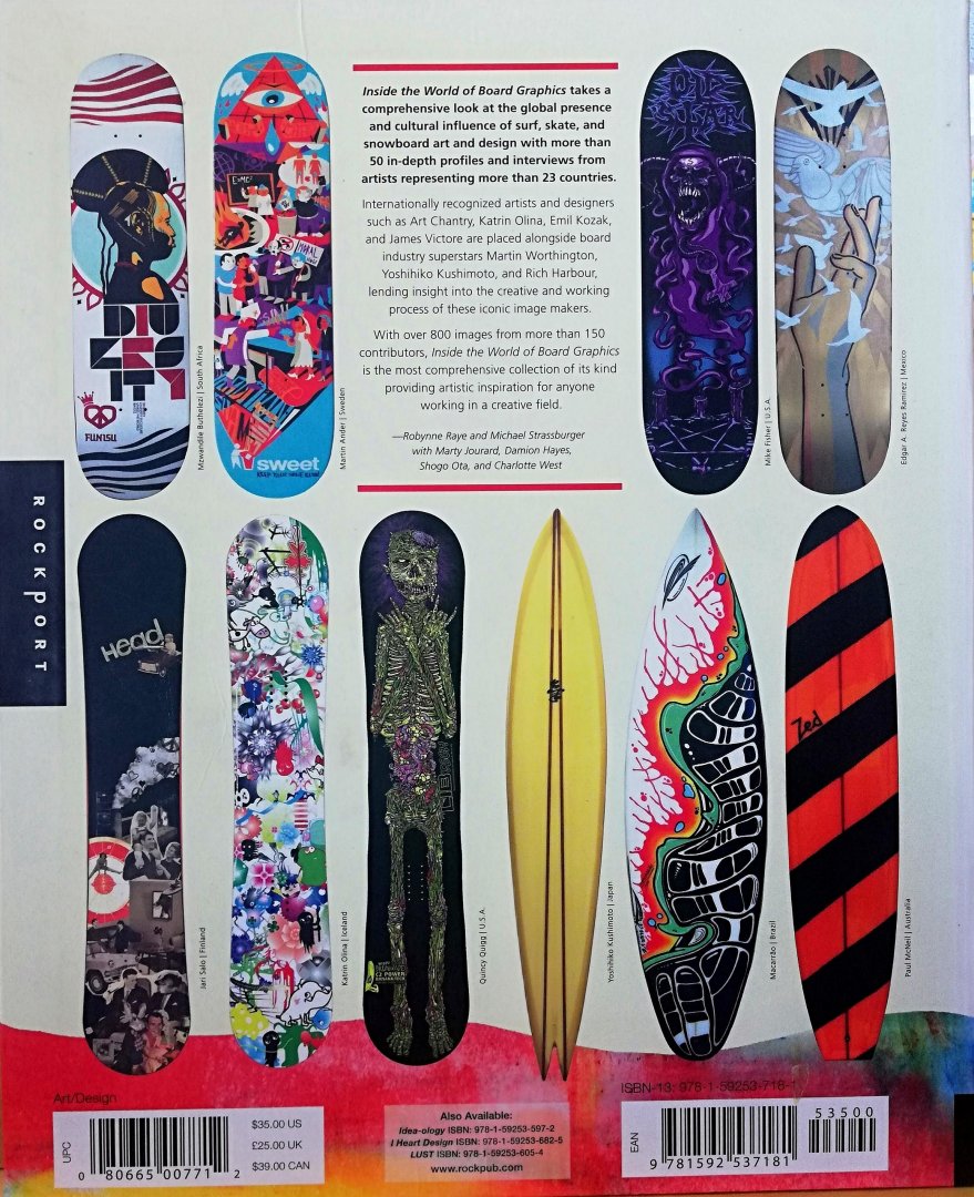 - luminaries Art Chantry, Katrin Olina and James Victore are placed along side industry super stars Terry Fitzgerald, Martin Worthington, Yoshihiko Kushimoto and Rich Harbour (who has been shaping and designing surfboards since 1959). The book includes dozens of interviews and profiles from the people currently creating board art and design: Aaron Draplin, Emil Kozak, Morning Breath, Anthony Yankovic, Haroshi and Hannah Stouffer to name a few. There are many books about the art of board design, but there has never been a book like this that takes a rare look behind the scenes of the creative process. Countries represented: Iceland, Spain, Japan, Brazil, Australia, Canada, Russia, Poland, UK, Mexico, Venezuela, Romania, South Africa, Finland, Sweden, Germany, Croatia and the USA, among others.