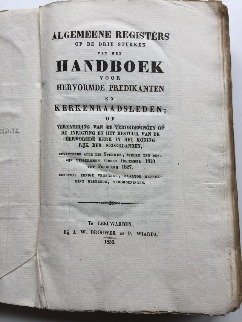 ' ... of Verzameling van de Verordeningen op de Inrichting en het Bestuur van de Hervormde Kerk in het Koningrijk der Nederlanden; bevattende alle de Stukken, welke ten deze zijn uitgekomen sedert December 1813 tot Februarij 1827. Benevens eenige vroegere, daartoe betrekking hebbende, Verordeningen'.