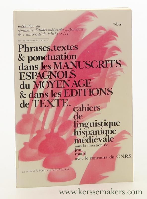 | Titel: | Phrases, textes en ponctuation dans les manuscrits espagnols du moyen age et dans les éditions de texte. Colloque organisé par le Séminaire d'Études Médiévales Hispaniques (Paris, 20-21 novembre 1981). |