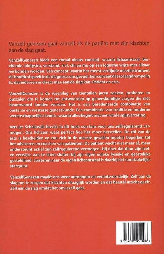Vanzelf Genezen is de weerslag van tientallen jaren zoeken, proberen en puzzelen om te komen tot antwoorden op geneeskundige vragen die niet beantwoord konden worden. Het is een beredeneerde combinatie van oosterse en westerse geneeskunde. Een combinatie van traditie en moderne wetenschappelijke kennis, waarin alles begint met een vitale spijsvertering. Arts Jes Schalkwijk breekt in dit boek een lans voor ons zelfregulerend vermogen. Ons lichaam weet perfect hoe het moet herstellen. De rol van de arts is bescheiden en zou zich in de meeste gevallen moeten beperken tot het adviseren en coachen van patiënten. De patiënt wacht niet meer af, maar ondersteunt actief zijn zelfregulerend vermogen. Hij doet dat door zijn leef- en eetwijze aan te laten sluiten bij zijn eigen unieke fysieke en geestelijke gesteldheid. Luisteren naar de eigen lichaamstaal is daarbij het noodzakelijke startpunt. Vanzelf Genezen maakt ons weer autonoom en verantwoordelijk. Zelf aan de slag om te zorgen dat klachten draaglijk worden en dat herstel inzicht geeft. Zelf aan de slag omdat het om jezelf gaat. |