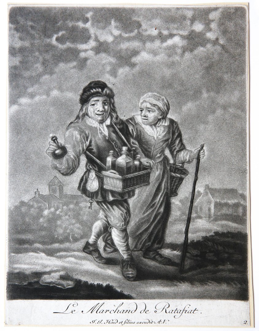 | Titel: | [Mezzotint] Le marchand de Ratafiat/De handelaar van Ratafia (versterkt druivensap/suikerbrandewijn). |